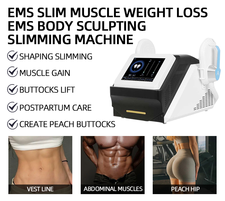 The effects of HI-EMT The medical research shows that after one course of treatment, it can effectively increase 16% muscleand reduce 19% fat at the same time. Exercising the abdominal muscles, shaping the vest line/exercising the hip muscles, creating the peach hips/exercising the abdominal oblique muscles, and Shaping the mermaid line. Improving abdominal muscles that become loose due to rectus abdominis, and shaping the vest lineIt is especially suitable for mothers who have an increased belly circumference and a loose belly dueto the rectus abdominis separation after delivery. To activate the collagen regeneration of the lower pelvic floor muscle tissue, tighten the loosened Pelvic floor muscles, solve the problem of urine infiltration and incontinence, and indirectly achievethe effect of tightening vaginal. Exercising strengthens the core muscles, including the abdominals of the major core(rectusminor core Core muscle groups can protect the spine, maintain trunk stability, maintain corteabdominis external oblique, internal oblique, transverse abdominis )and the gluteus maximus of thposture, improve athletic ability and reduce the chance of injury, provide structural support to thewhole body, and create a young body.