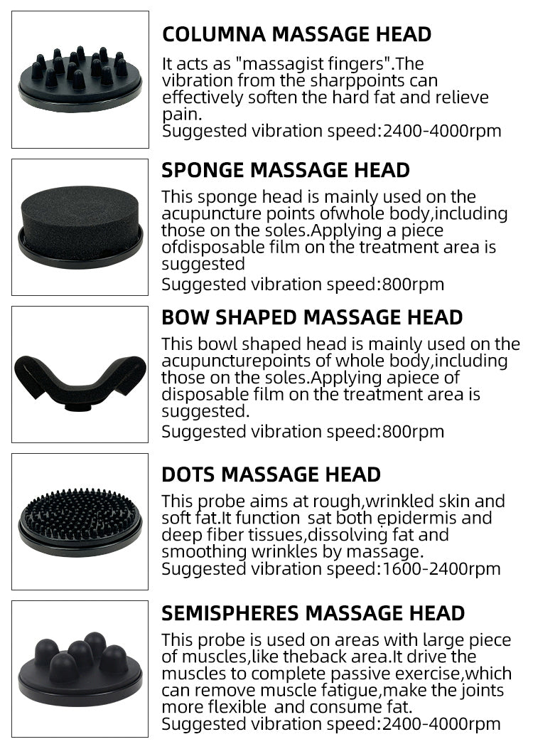 This equipment is based on the principle of physical therapy vibration. The vibration energy emitted by various shaped probes can dissolve fat layers and accelerate blood circulation to achieve body slimming effect. At the same time, it can effectively relieve muscles tension and fatigue, and remove puffiness.