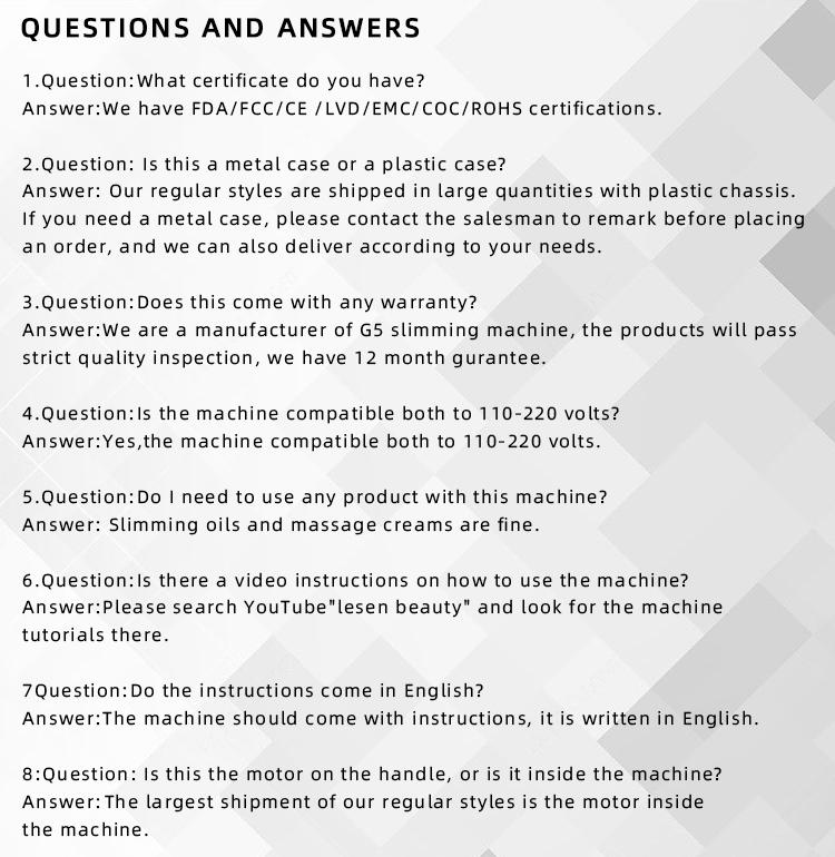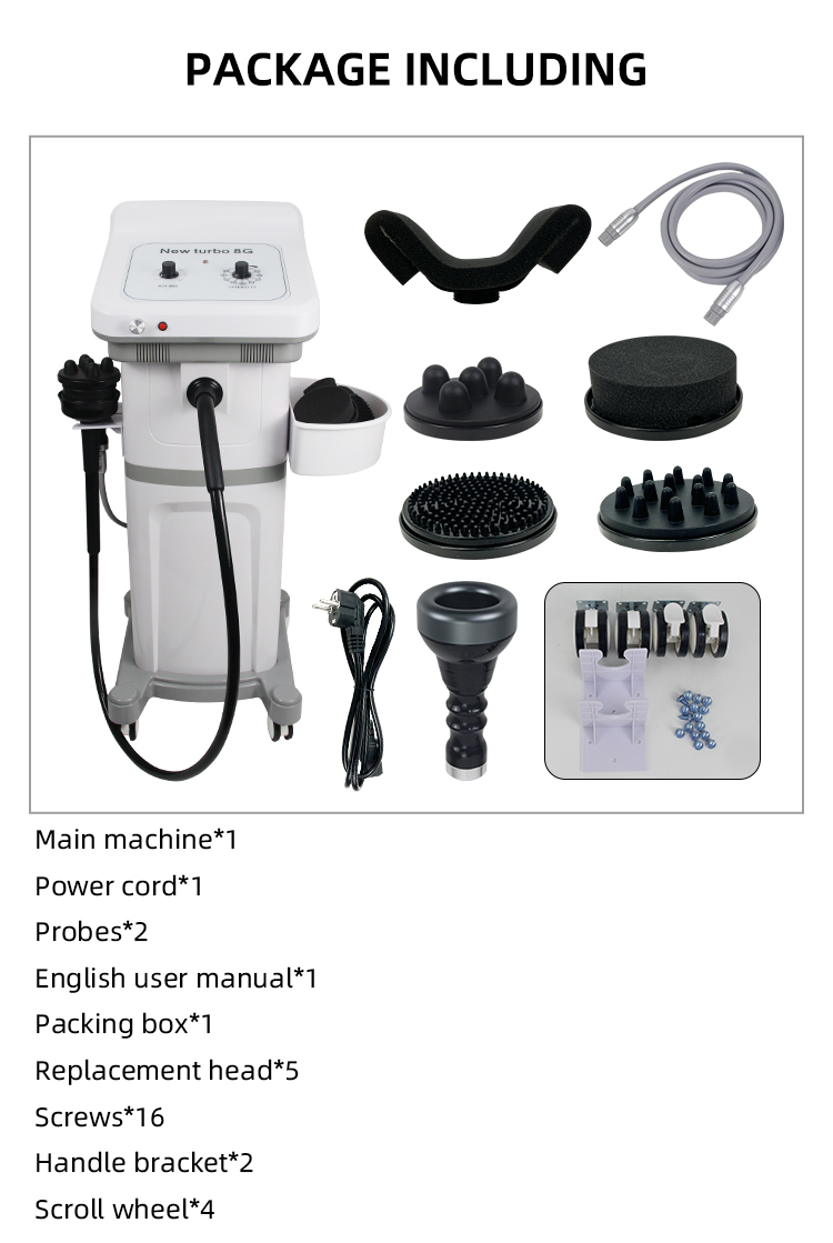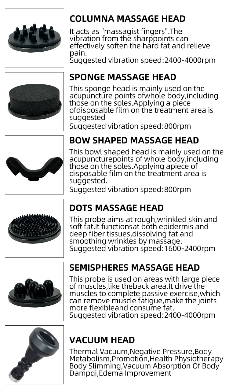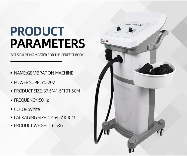 8G Massager Principle: This equipment is based on the principle of physical therapy vibration. The vibration energy emitted by various shaped probes can dissolve fat layers and accelerate blood circulation to achieve body slimming effect. At the same time, it can effectively relieve muscles tension and fatigue, and remove puffiness. Functions: 1. Body slimming and shaping 2. Blood circulation 3. Soothing the nerve system 4. Regulating endocrine 5. Removing muscle fatigue