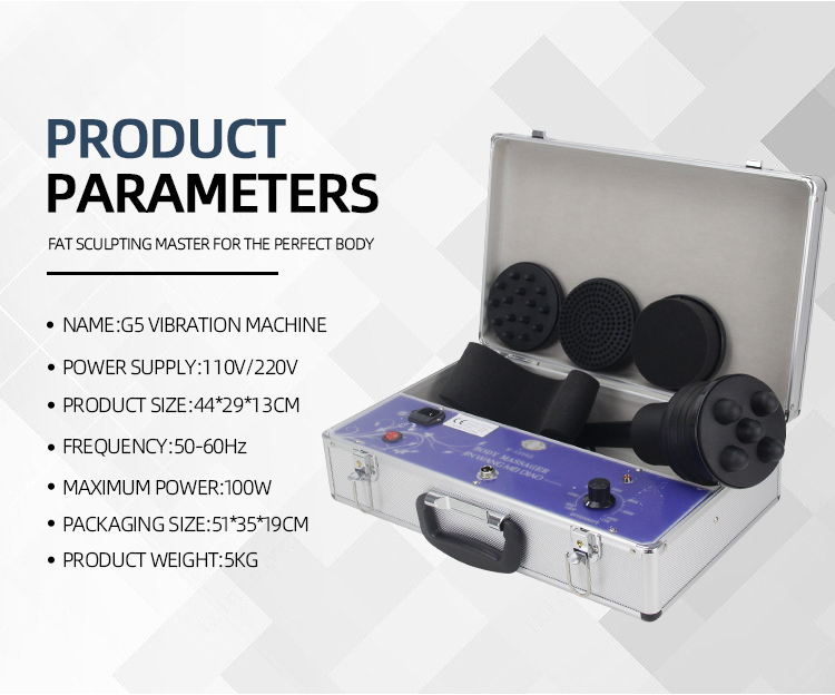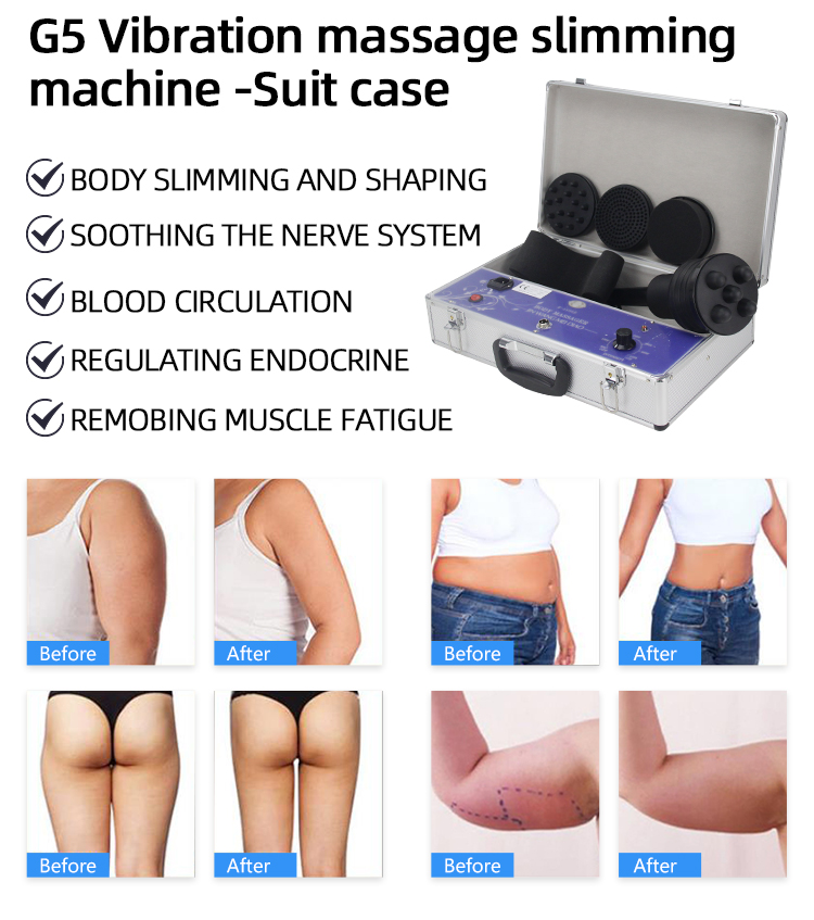 Principle of mini G5 vibration: This equipment is based on the principle of physical therapy vibration. The vibration energy emitted by various shaped probes can dissolve fat layers and accelerate blood circulation to achieve body slimming effect. At the same time, it can effectively relieve muscles tension and fatigue, and remove puffiness.