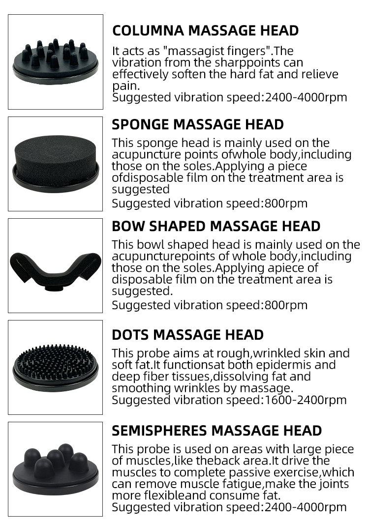 1. Five different shaped massage heads; 2. Operation time can be set in advance. 3. Multiple speed levels adjustable; 4. Easy and convenient operation; 1. Body slimming and shaping; 2. Blood circulation; 3. Soothing the nerve system; 4. Regulating endocrine; 5. Removing muscle fatigue.